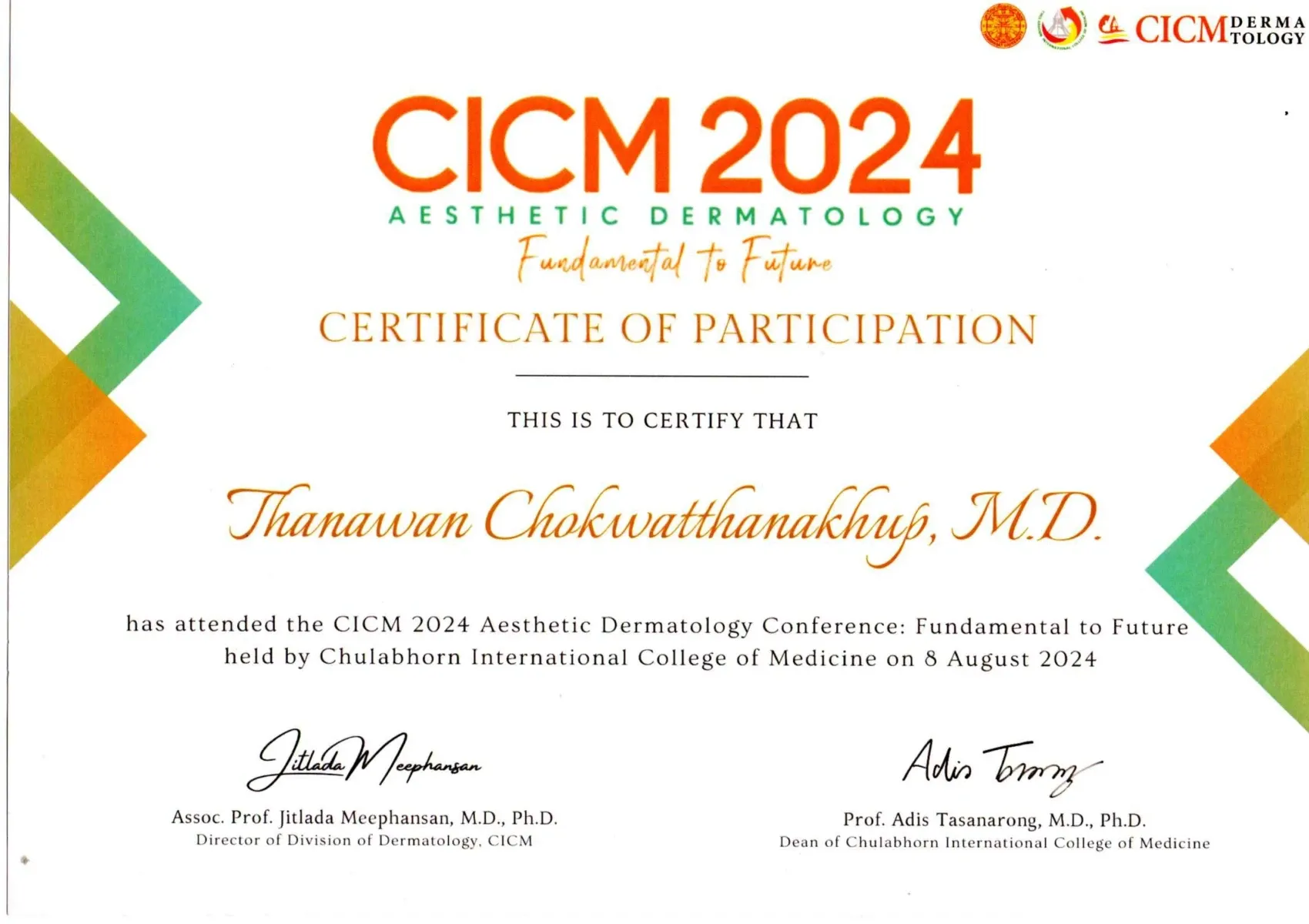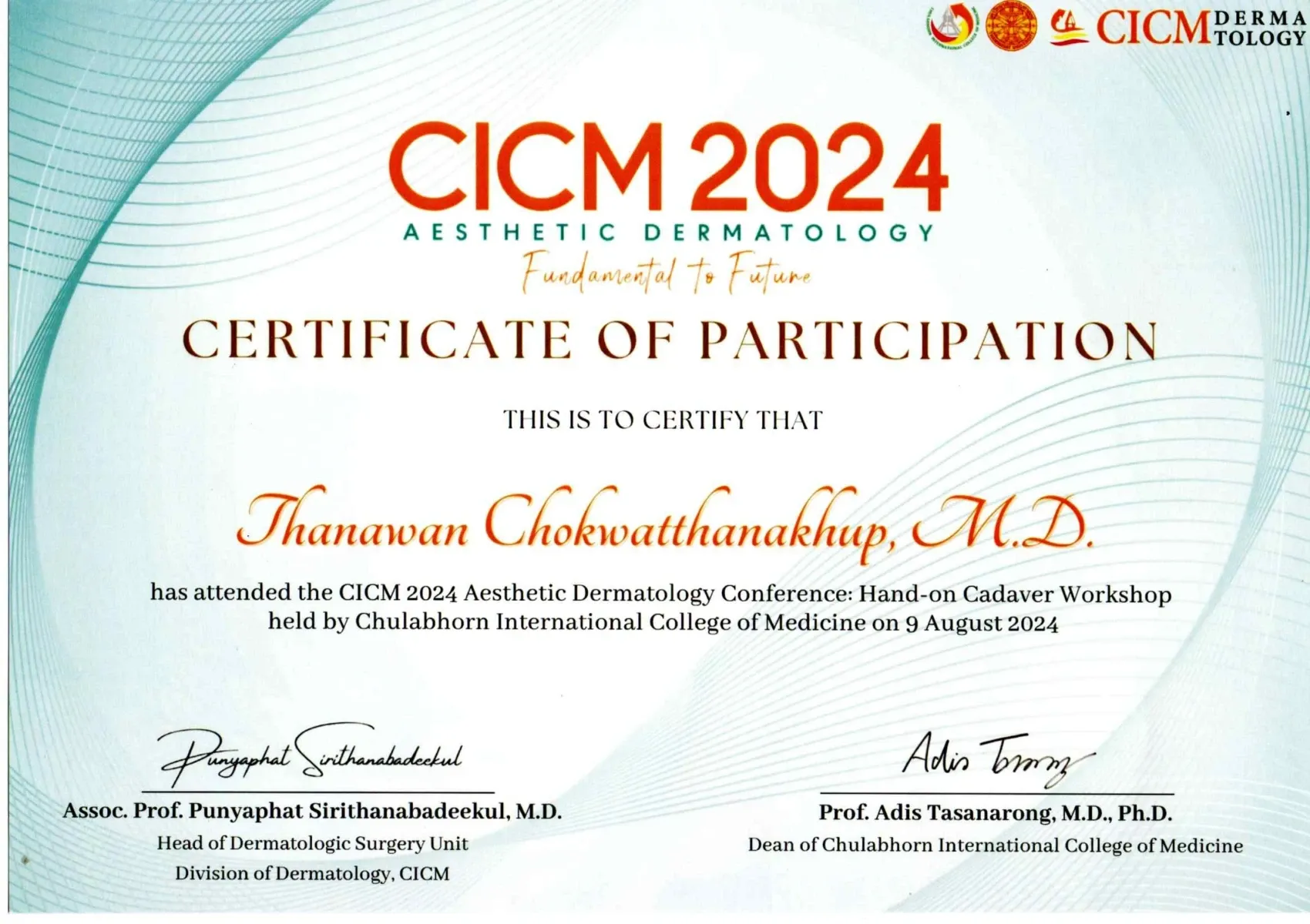 Certificate the CICM 2024 Aesthetic Dermatology Conference: Fundamental to Future held by Chulabhorn International College of Medicine, Bangkok, Thailand