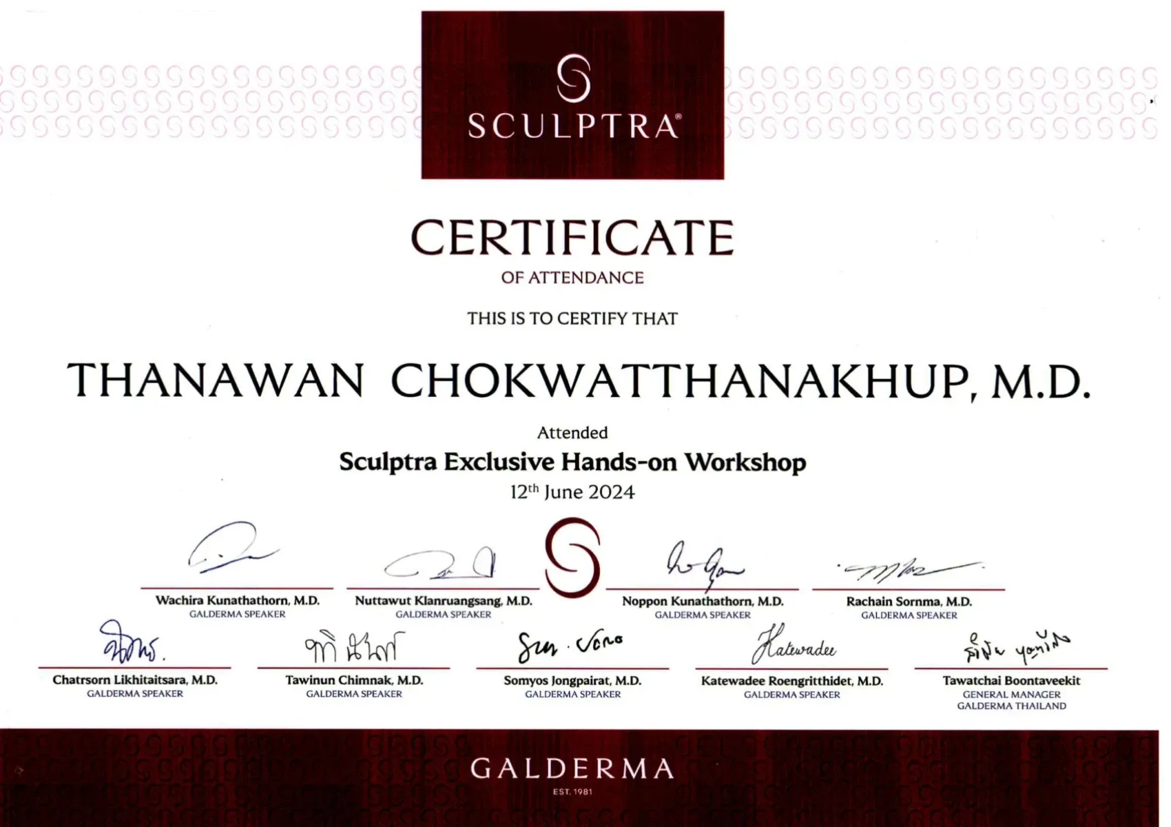 Certificate Sculptra Exclusive Hands-on Workshop, Bangkok, Thailand