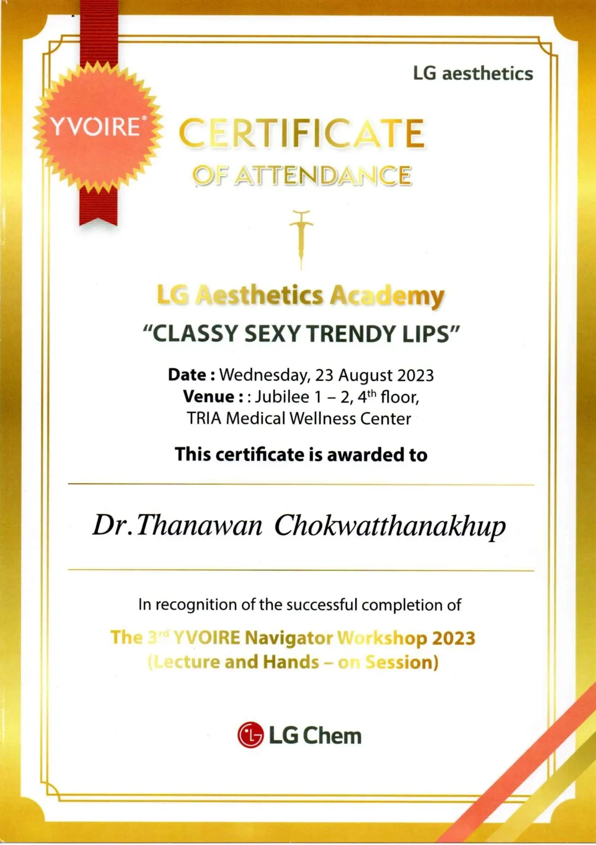 Certificate LG Aesthetics Academy : Classy Sexy Trendy Lips, Yvoire Navigator Workshop, Bangkok, Thailand