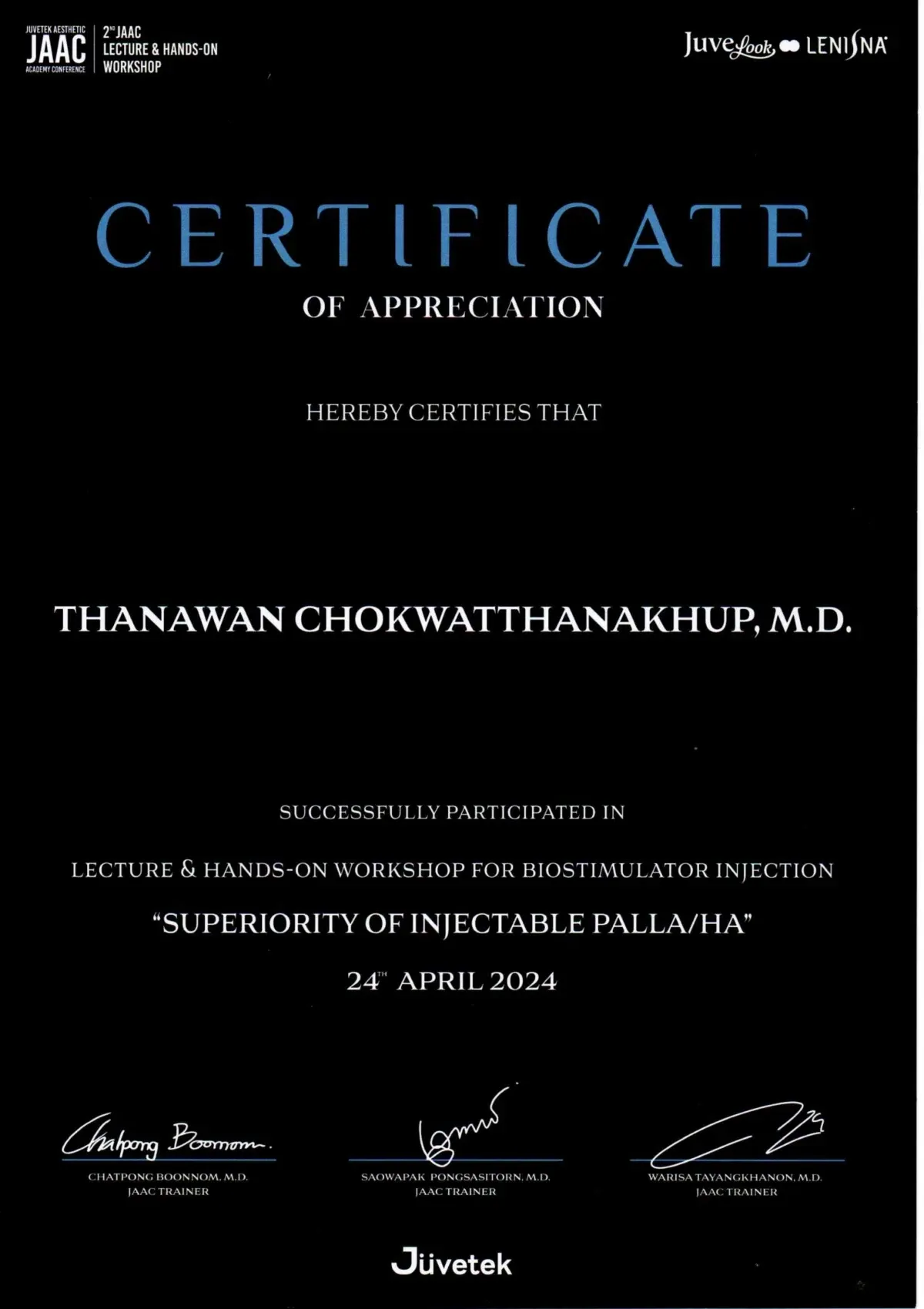 Certificate the CICM 2024 Aesthetic Dermatology Conference: Hand-on Cadaver Workshop held by Chulabhorn International College of Medicine, Bangkok, Thailand